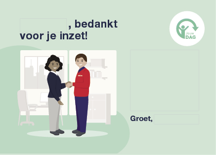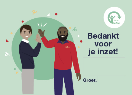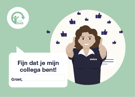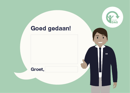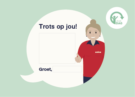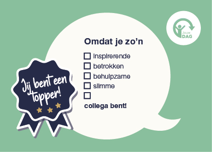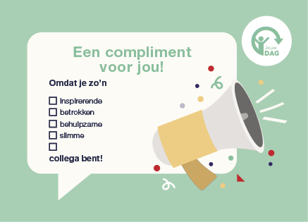 Wij vinden dat jij en jouw collega’s vaker een compliment verdienen! Daarom kun je gebruikmaken van de Jouw DAG complimentenkaarten. Ontvang complimenten van collega’s en laat ook hen weten wat je aan ze waardeert. Een compliment kan betrekking hebben op bepaalde kwaliteiten, een werkprestatie, iemands gedrag en houding. Dit moet je doen om een kaart te versturen: