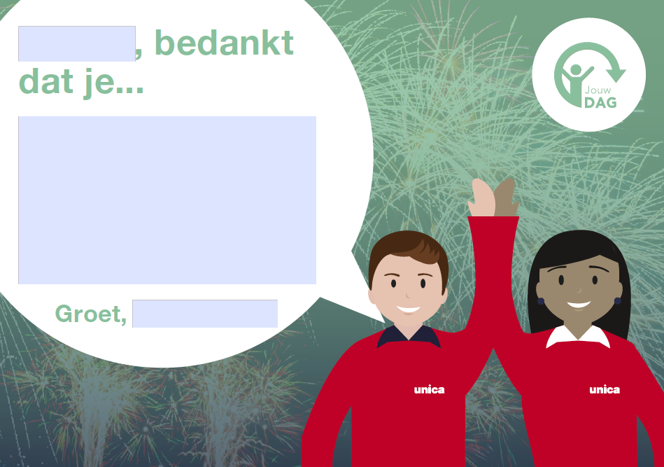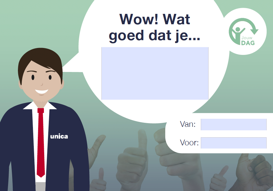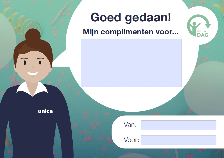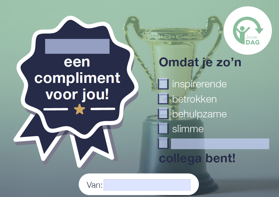 Wij vinden dat jij en jouw collega’s vaker een compliment verdienen! Daarom kun je gebruikmaken van de Jouw DAG complimentenkaarten. Ontvang complimenten van collega’s en laat ook hen weten wat je aan ze waardeert. Een compliment kan betrekking hebben op bepaalde kwaliteiten, een werkprestatie, iemands gedrag en houding. Dit moet je doen om een kaart te versturen: