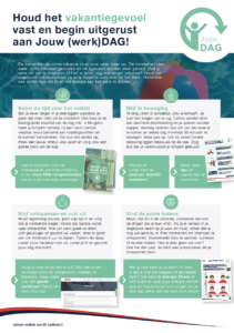 Je herkent het misschien wel: je hebt een paar dagen of weken vrij gehad en je neemt je voor om je niet compleet te verliezen in je werk. In plaats daarvan zou het heerlijk zijn om dat ontspannen gevoel wat langer vol te houden, ook tijdens het werken! Daarvoor hebben we een aantal tips voor je op een rijtje gezet. Pak het inspiratiedocument erbij, print ‘m desnoods uit en hang hem op. Zo houd je het vakantiegevoel zo lang mogelijk vast.